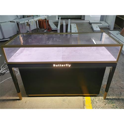 片尺寸價格說明定做服務。珠寶展柜的款式參考珠寶品牌海瑞溫斯頓的設(shè)計,采用了黑色加金色的組合搭配,展柜主體框架為拉絲不銹鋼經(jīng)刨槽折彎、激光切割、無縫焊接、拋光打磨等5道工序加工精制而成,下方柜體為木基層夾板釘裝黑色半啞光漆飾面。