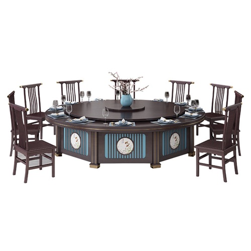 。這款會所包間新中式實木電動餐桌自動轉(zhuǎn)盤大圓桌是由經(jīng)典的深棕色與藍色搭配。轉(zhuǎn)盤和桌面的顏色與圍板的顏色都設(shè)計為一體色彩,讓電動餐桌上下更加呼應(yīng),圍板噴藍色,承重柱子采用了金色不銹鋼裝飾,簡潔大方,深受客人們的喜愛。