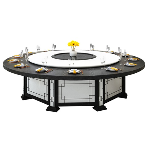 酒店新中式自動旋轉15人20人大圓桌電動餐桌采用的是經(jīng)典黑白顏色的搭配,以傳統(tǒng)的窗花花格作為設計元素,體現(xiàn)中國傳統(tǒng)文化的傳承,