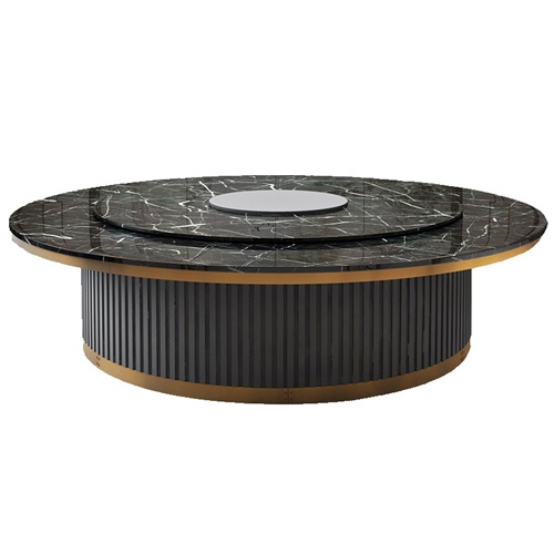 酒店包廂大理石豪華電動(dòng)餐桌大圓桌,是由黑色大理石桌面鈦金包邊,底座也用了鈦金包邊,這樣