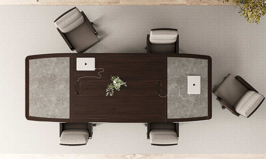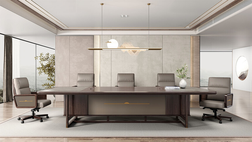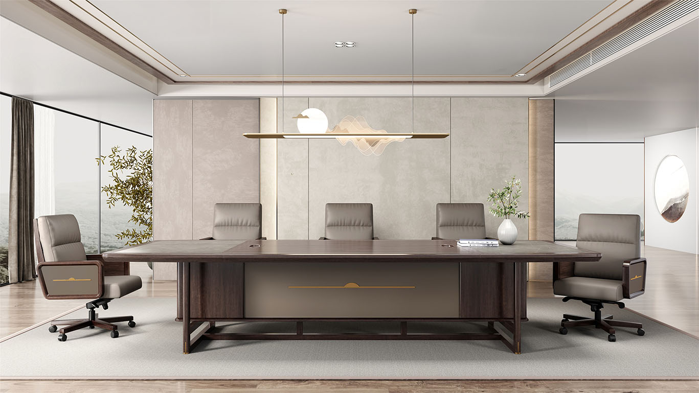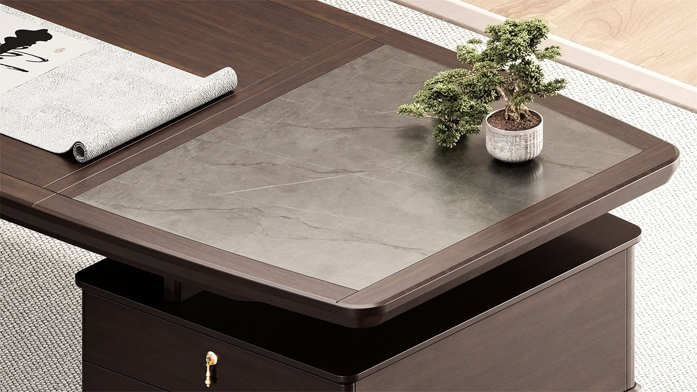 鴻泰系列是一款新中式風格的辦公家具,設計靈感源于中式傳統(tǒng)裝飾紋樣“回”字形,因其形式回環(huán)反復,延綿不斷,在民間有“富貴不斷頭”的說法,有連綿不斷、吉利長久的吉祥寓意,在造型上主要采用硬朗簡潔的直線條,溫潤的烏金木與質(zhì)樸的巖板相結(jié)合,剛?cè)岵?,時尚大方,既使得中式家具古典、質(zhì)樸的內(nèi)涵顯現(xiàn),又符合現(xiàn)代辦公追求的時尚感、實用性。