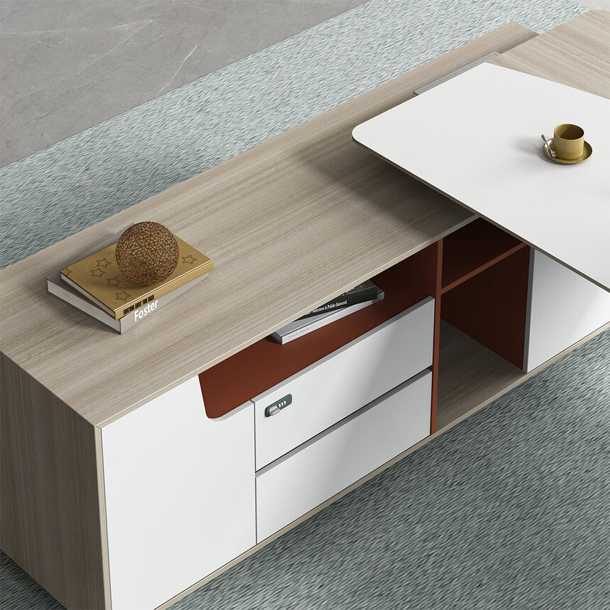 優(yōu)格又名“有格”,代表了有品格、有格調(diào)。產(chǎn)品整體以“青春、時尚、動感”為設(shè)計主題,采用了大量的弧形與直線條交叉設(shè)計,將產(chǎn)品魅力展示的淋漓盡致。在一貫沉穩(wěn)的深色辦公配色中,大膽運(yùn)用了白色、卡其棕色與淺色木紋的撞色搭配,打破產(chǎn)品配色原有的嚴(yán)肅氛圍,賦予了產(chǎn)品生命力以及活力。獨(dú)特的臺腳與桌屏設(shè)計,動感十足,無不展示產(chǎn)品的細(xì)節(jié)之美。產(chǎn)品設(shè)計時尚,配置齊全,適合各種規(guī)模的辦公場所。